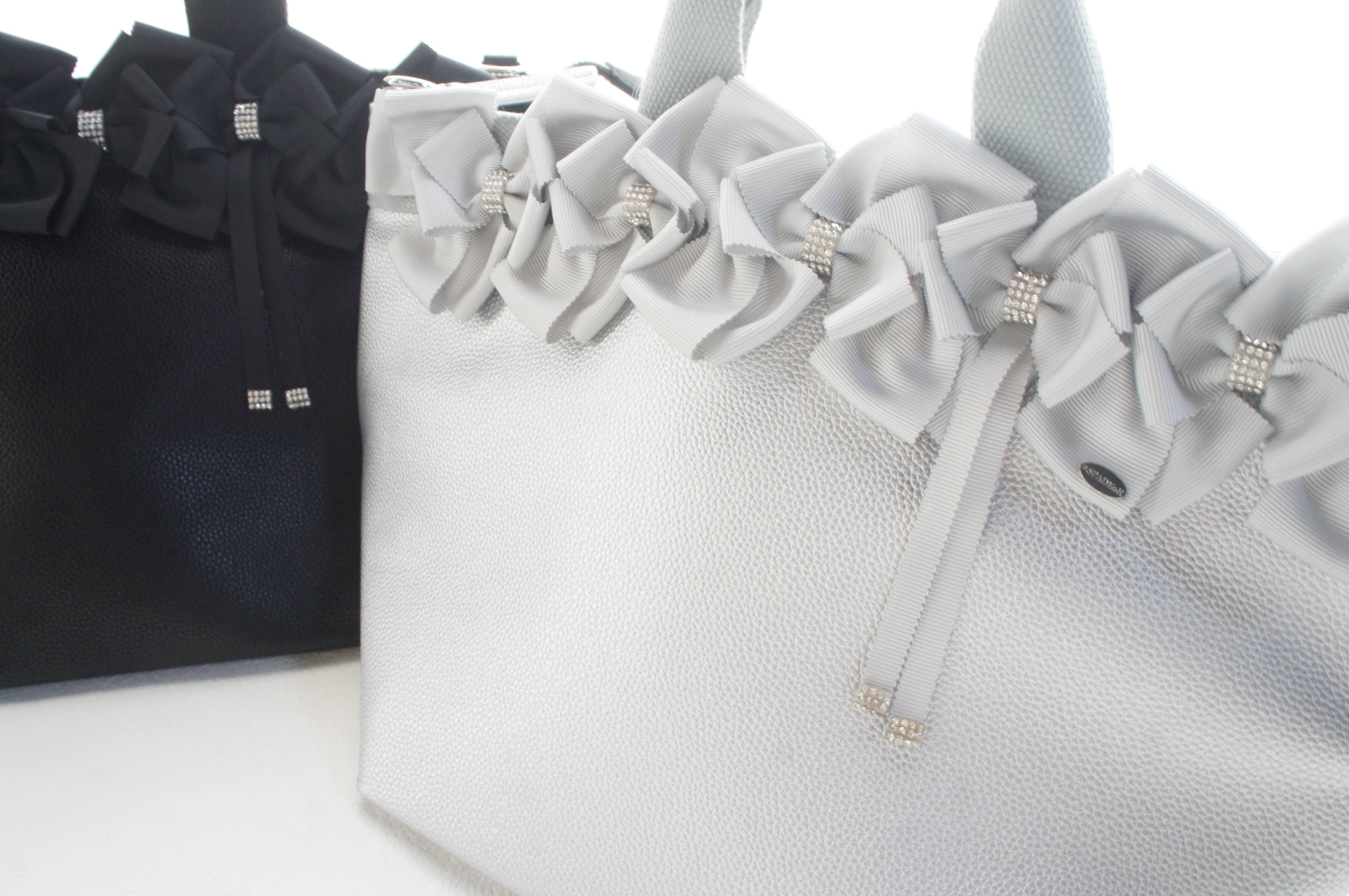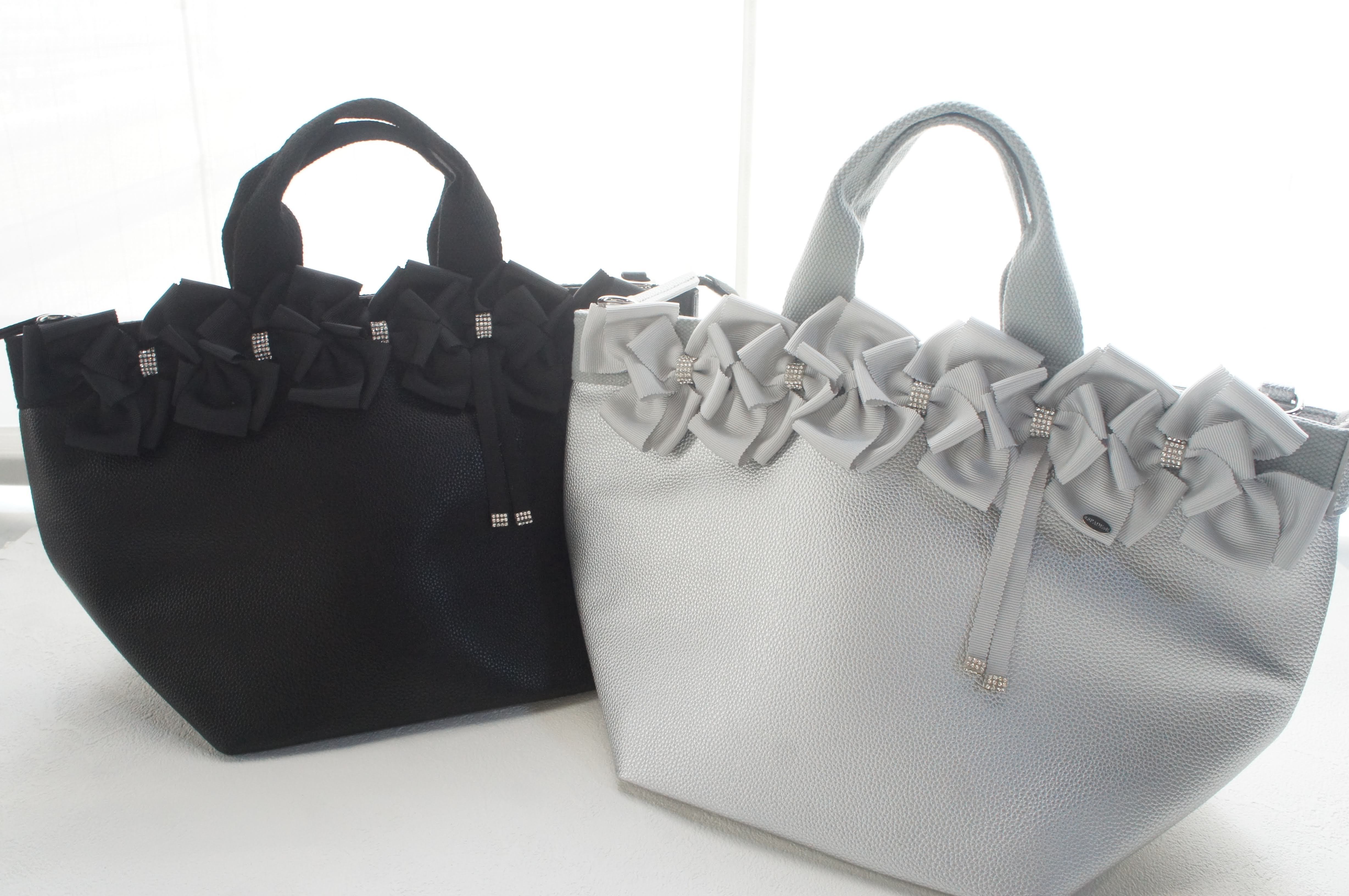 上品な「シャイニーシルバー」 シャイニーシルバーのトートバッグにライトグレーのリボンを使用。